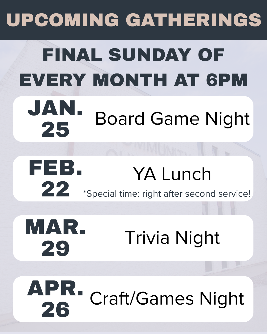 Young Adults is a place for people ages 18-29 to talk about life, connect with Jesus + others, and ask the tough questions.